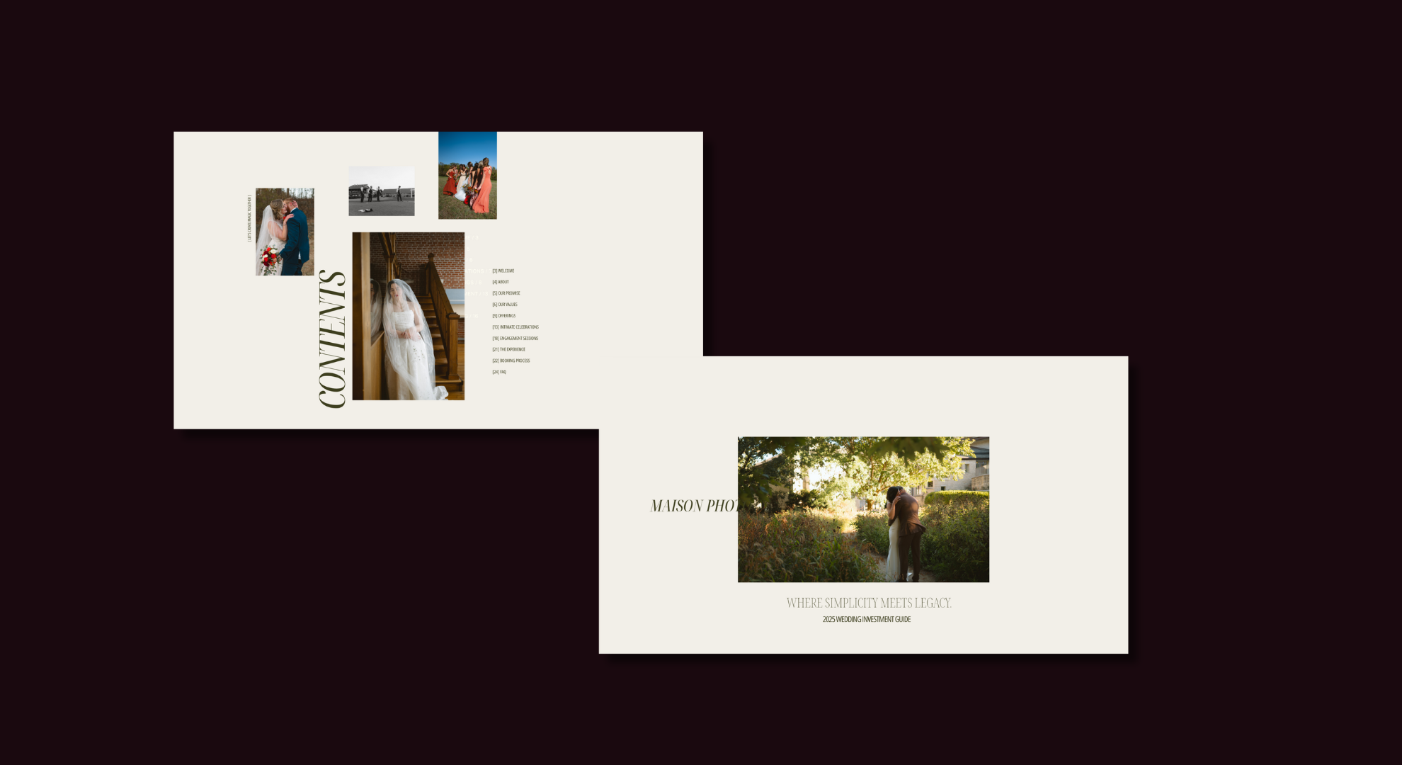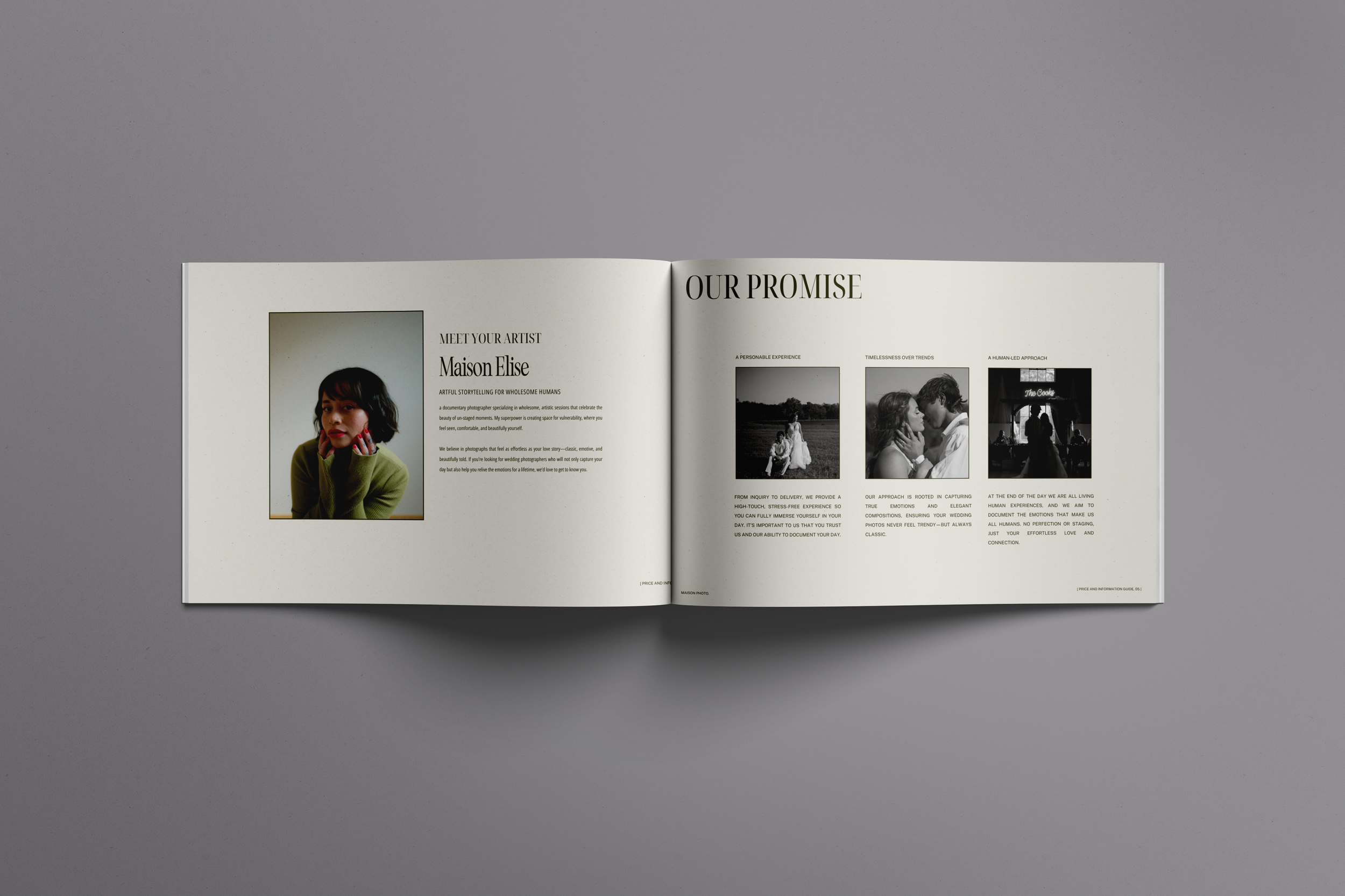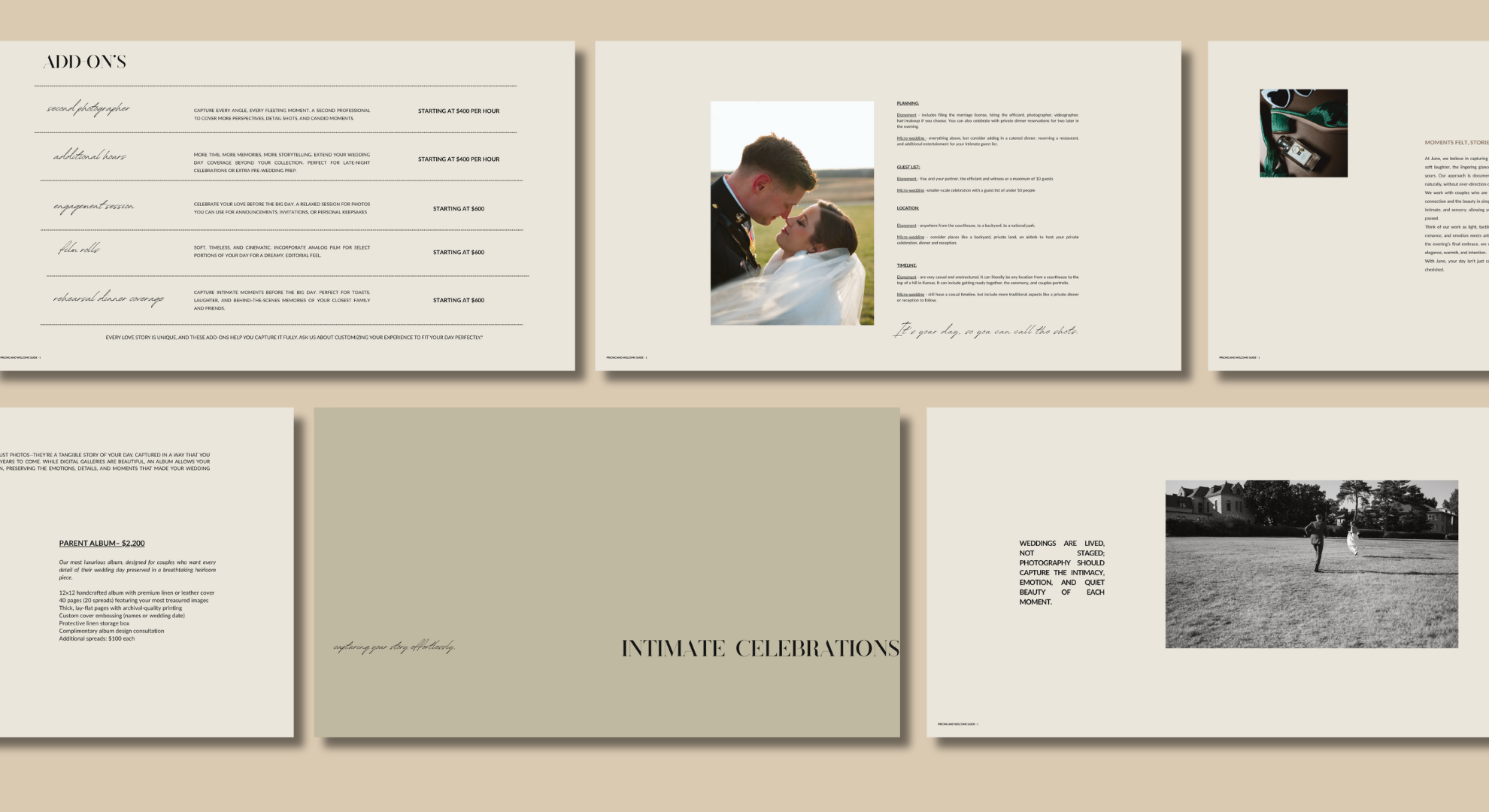 The Martini Services Guide Template was made for photographers who want to attract luxury clients and elevate their brand presence with bold, editorial design. With its rich typography, modern layouts, and sophisticated feel, Martini communicates elegance and exclusivity at every page turn.