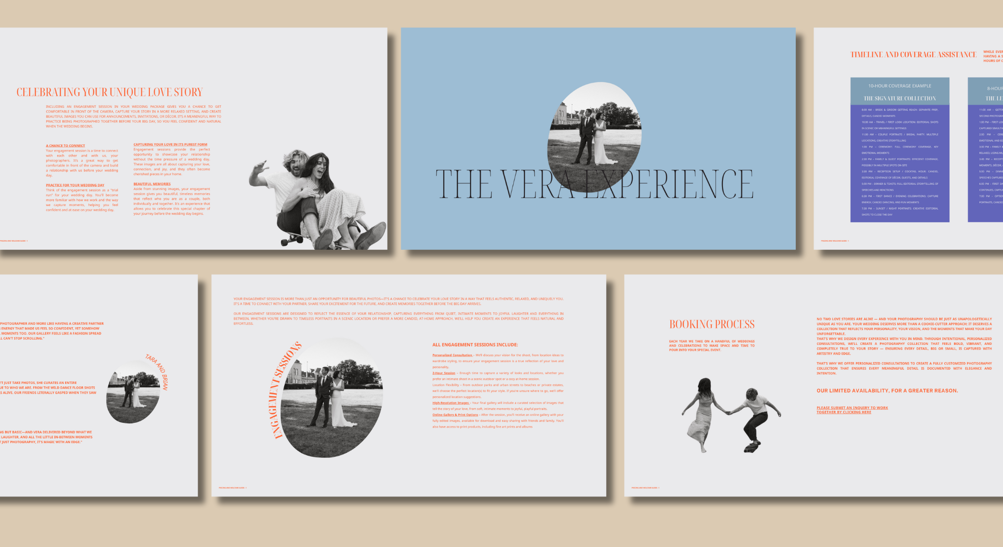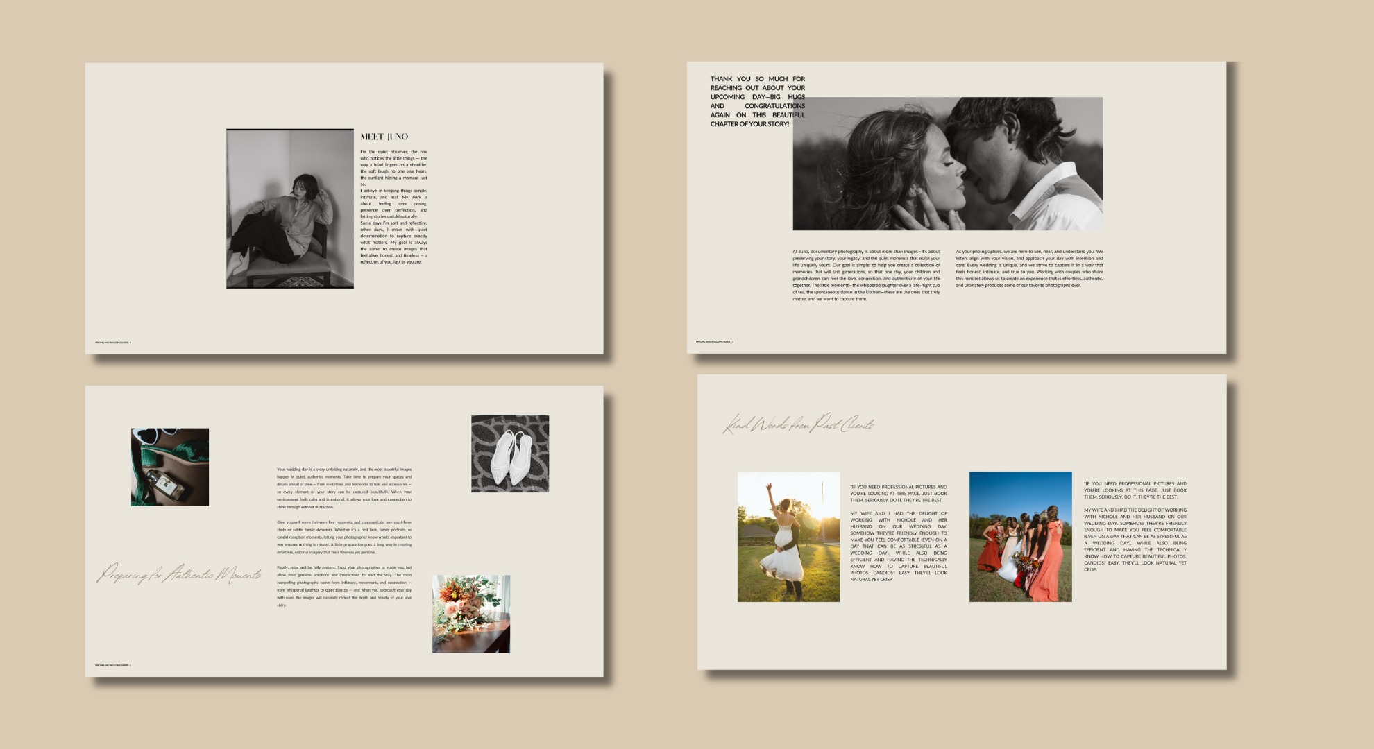 Inside, you’ll find fully customizable Canva layouts for your welcome message, about page, brand promise, investment collections, engagement sessions, add-ons, FAQs, and booking process. With built-in copy prompts, you can quickly personalize the template to reflect your brand voice while maintaining a refined and professional tone.